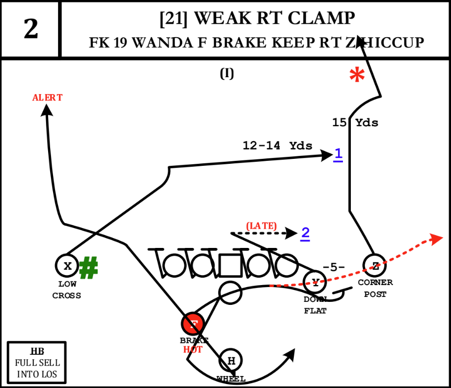 The goal of Hiccup is to sell the usual keeper pass to the defense. The offense wants every defender to feel like they have seen this play a thousand times. Once the defenders are comfortable and commit to the corner route, Hiccup sends a receiver or tight end on a corner post double move into wide open space.